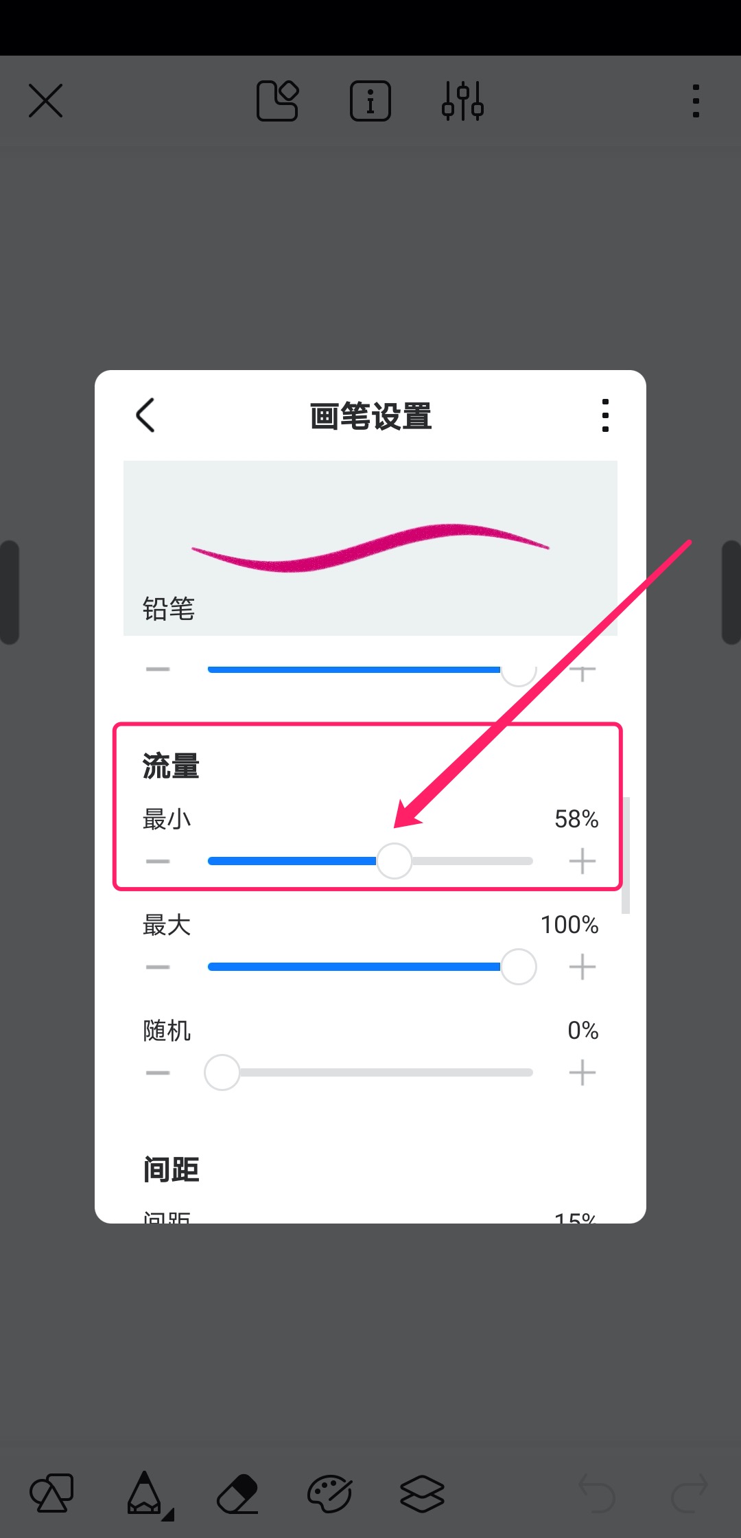 第二步,设置画笔的最小“流量”数值,把流量调大一点